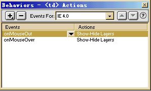在“行為目標(biāo)”(events for)中選擇一個合適的瀏覽器,一般是選擇“ie 4.0”。然后單擊左邊的“+”按鈕,來添加行為。在彈出的菜單中選擇“顯示或隱藏層”(show-hid layers), 在彈出的窗口中選擇“l(fā)ayer “l(fā)ayer1””,就是我們剛才添加的那個層了,再單擊“顯示”(show),確定就行了。這時在行為欄中就出現(xiàn)了我們剛剛添加的這個行為了。接著單擊“事件”(events)下面右邊的那個向下箭頭按鈕,在彈出菜單中選擇“當(dāng)鼠標(biāo)移上”(onmouseover)。好了,這樣當(dāng)頁面載入時,這個層并不會出現(xiàn),只有當(dāng)我們的鼠標(biāo)移上單元格時才會出現(xiàn),怎樣?酷吧?stop!不要高興得太早了,不要忘了還有一個問題:鼠標(biāo)移開單元格之后這個層還是顯示著的呀!并不會自動消失的。(不要把電腦當(dāng)成全自動的,你不告訴它怎么做時,它只是一堆廢鐵。^_^)其實解決這個問題也很容易,我們可以添加顯示層的行為,當(dāng)然也可以添加隱藏層的行為呀!再單擊“+”按鈕,選取“顯示或隱藏層”,還是選取“l(fā)ayer1”,不過這次我們點擊的是“隱藏”(hide)了,再確定。然后選擇“事件”,單擊“當(dāng)鼠標(biāo)移開”(onmouseout)。ok!完成了。
