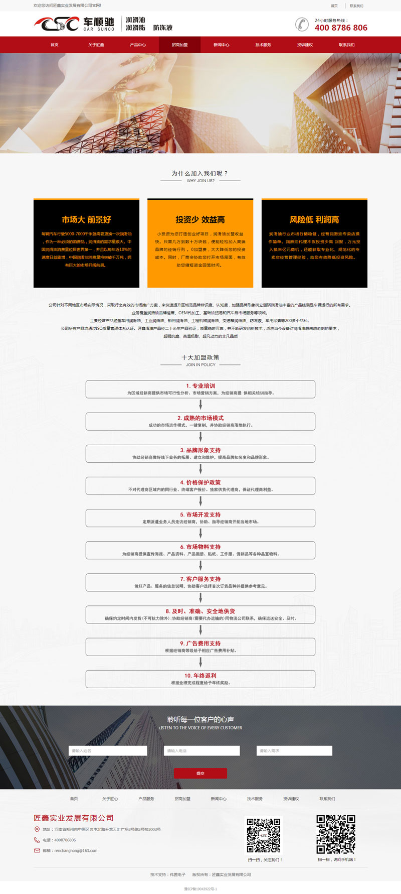 頁(yè)面簡(jiǎn)潔大方,網(wǎng)站以紅、黑、白為主色調(diào),色彩搭配協(xié)調(diào),更能突出重點(diǎn)。招商加盟欄目以單頁(yè)的形式展示,內(nèi)容豐富,更能吸引客戶(hù)。